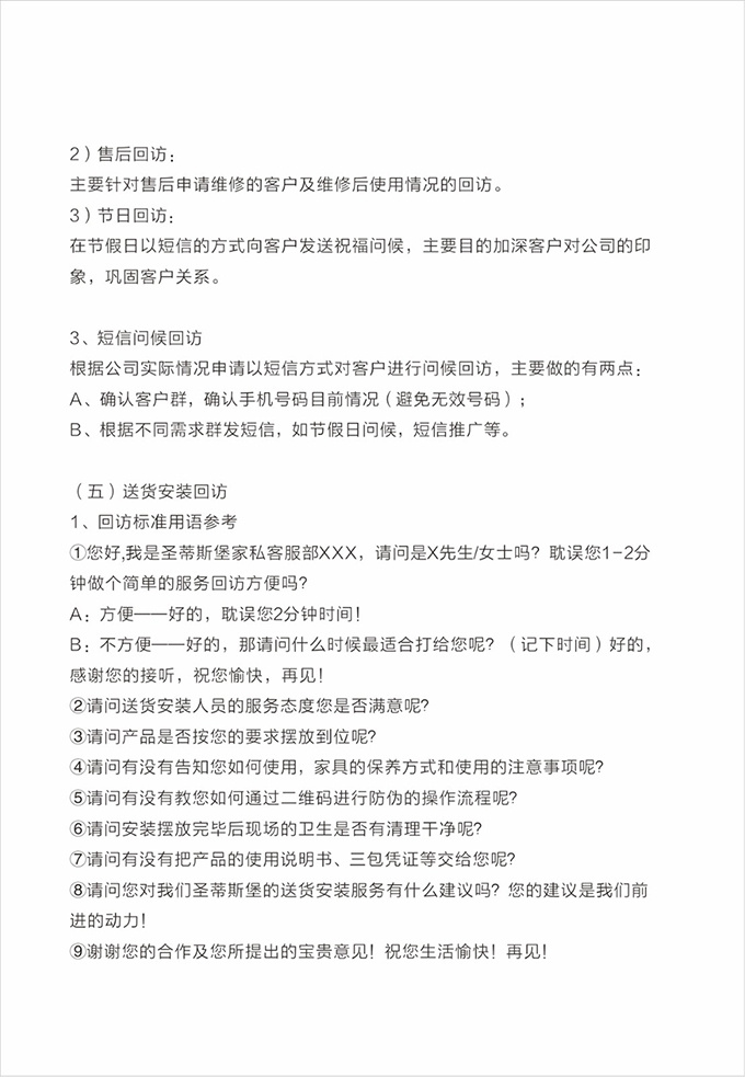 話術參考:“**先生/女士您好,我是我們的售后服務人員**,您購買的我們家具已經全部到貨了,送貨安裝大約需要**時間,請問您這邊什么時候方便我們上門送貨安裝呢?”同時要了解送貨小區的電梯、樓道、入戶門的尺寸等,提前做好準備,避免意外情況。最后確定送貨時間(安裝所需要時長),并告知客戶安裝人員的相關信息,可加微信發送,并發送配送安裝流程說明。