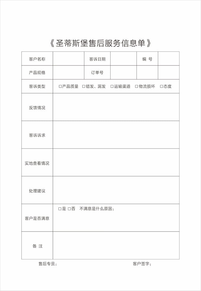 按要求認真填寫服務記錄單據并請顧客填寫相應內容及簽字,離開顧客處時除了與顧客本人告別外,還需要向有關負責人打招呼,詢問是否還有其他問題,當得到顧客的滿意允許后,方可離開。